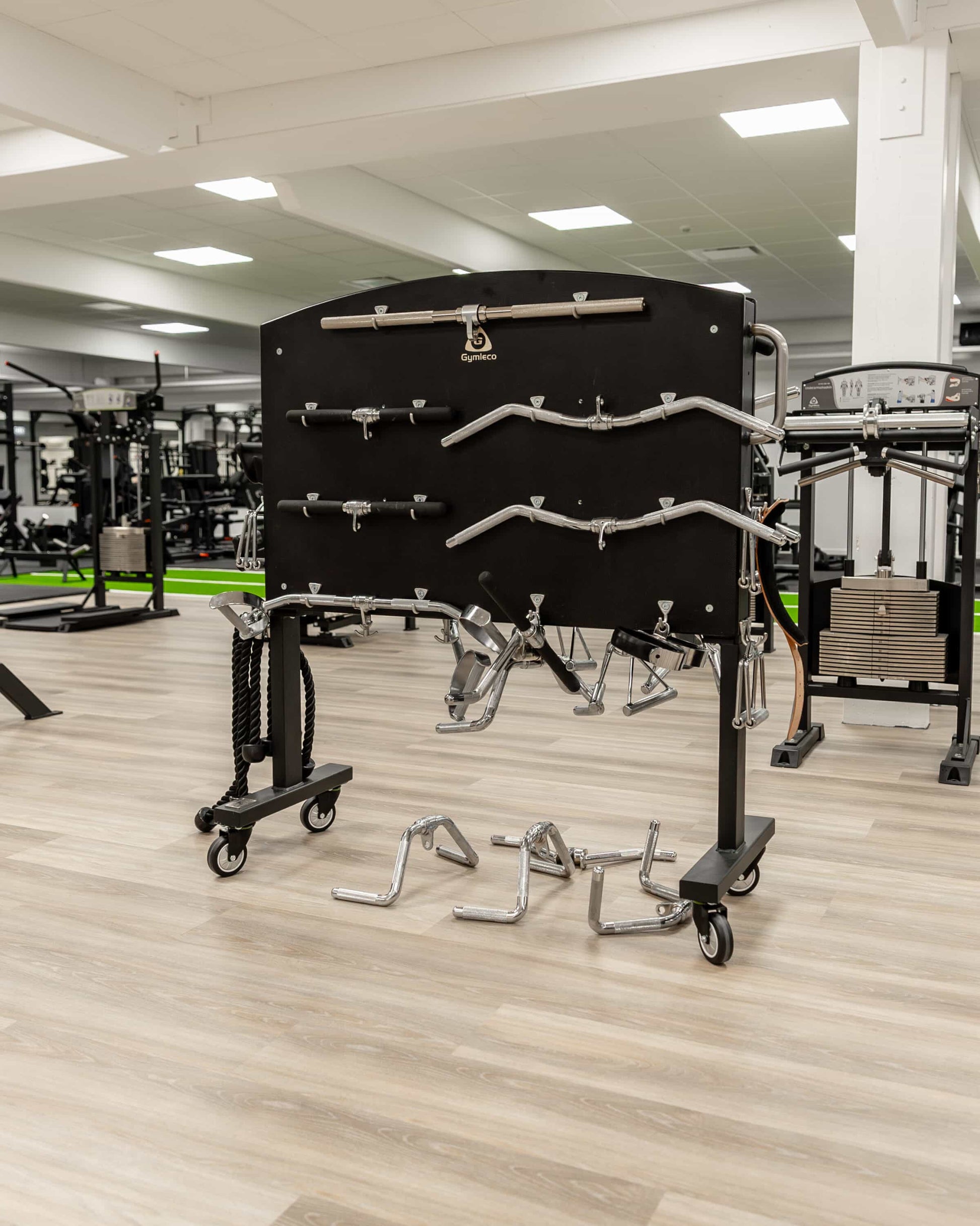 Gymleco has the solution for optimal handle storage in your gym. This handles and accessories carriage has two sides which means a lot of equipment can be stored in it. It also has wheels which means that you can move it wherever you need to. A stylish equipment that is very practical!